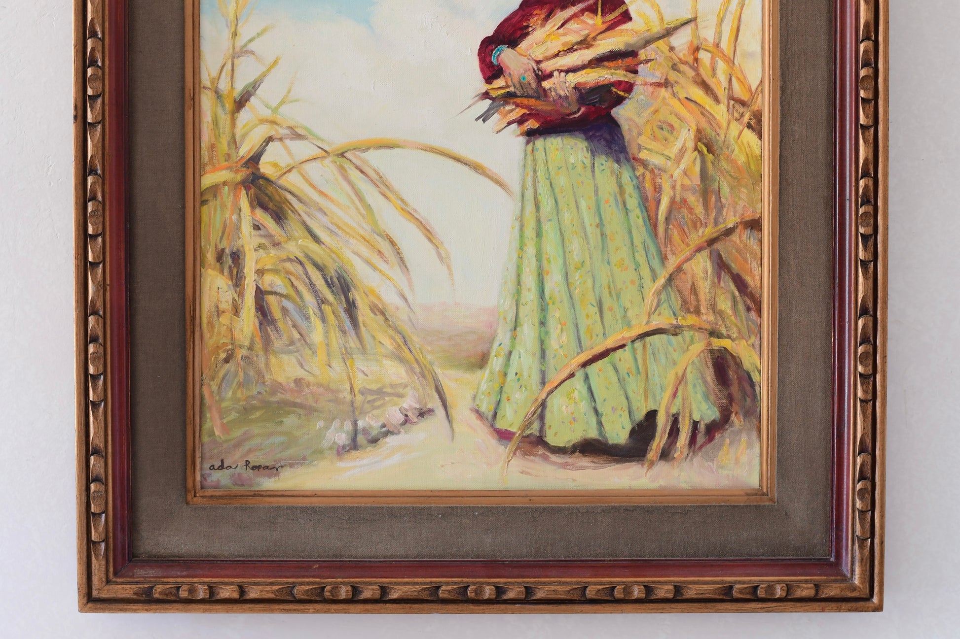 Original Navajo Women Oil Painting Collecting Corn Signed Ada